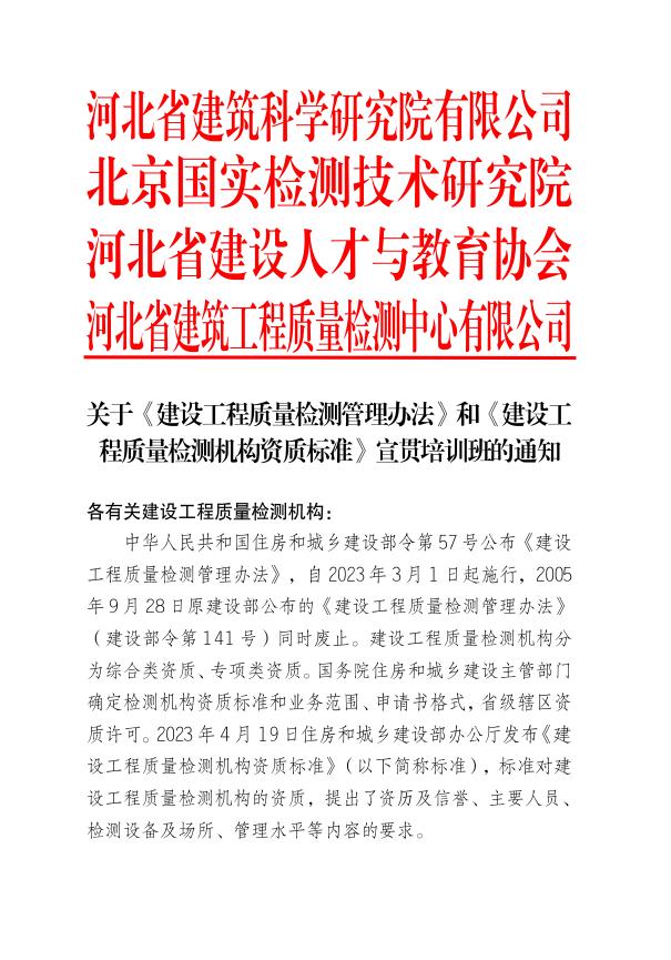 關(guān)于《建設(shè)工程質(zhì)量檢測管理辦法》和《建設(shè)工程質(zhì)量檢測機構(gòu)資質(zhì)標(biāo)準(zhǔn)》宣貫培訓(xùn)班的通知