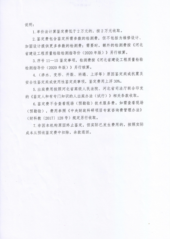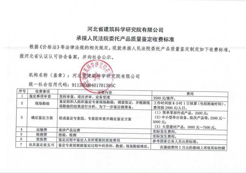 根據《河北省認證認可協會產品質量鑒定管理辦法(試行)》第36條、《河北省認證認可協會工程質量鑒定管理辦法(試行)》第35條“目前國家物價管理部門未對工程質量鑒定收費進行統一定價,鑒定機構應當公示本機構收費標準”之規定,我公司參照財政部財科教【2017】128號《中央財政科研項目專家咨詢費管理辦法》中的有關規定,并結合我公司產品質量鑒定和工程質量鑒定中鑒定專家工作的實際情況,制定了《河北省建筑科學研究院有限公司產品質量鑒定/工程質量鑒定收費標準》(見附件)。現予以公示。