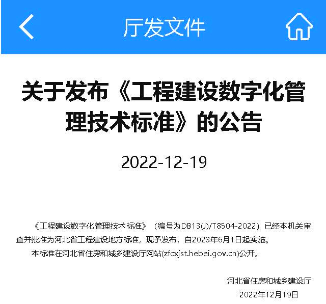2022年12月19日,由河北省建筑科學研究院有限公司、河北省住房和城鄉建設廳信息宣傳與檔案中心和北方工程設計研究院有限公司共同主編的《工程建設數字化管理技術標準》(編號為DB13(J)/T8504-2022)已經河北省住房和城鄉建設廳審查并批準為河北省工程建設地方標準,自2023年6月1日起實施。