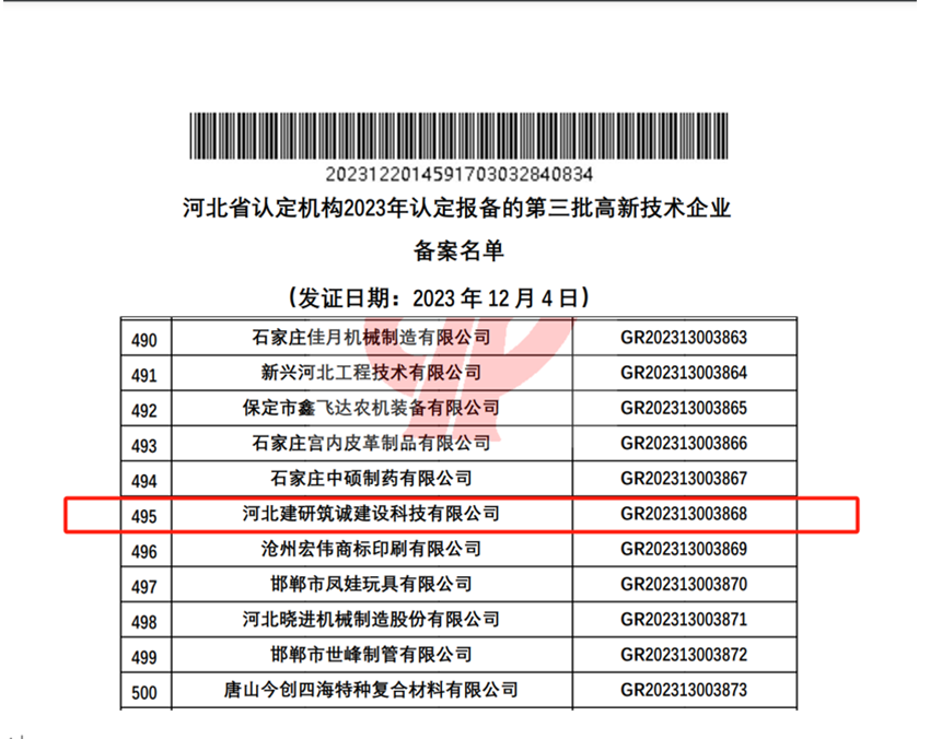 20231220日,全國高新技術企業認定管理工作領導小組辦公室公示了河北省認定機構2023年認定報備的第三批高新技術企業備案名單,河北建研筑誠建設科技有限公司順利通過了國家高新技術企業認定(證書編號GR202313003868),標志著公司在科技創新的道路上又邁出了堅實的一步。